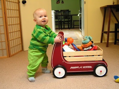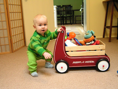 Here is Aidan in action with his walker wagon. Before too long he'll be walking on his own! These pictures are from Feb 5th. The second picture looks like he's practicing his squats. Gotta stay in shape! I've got some more recent pics coming up, but wanted to make sure you all got to see him with his favorite toy!